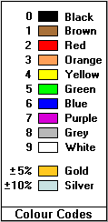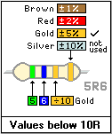 Two other colours are also widely used; gold and silver, commonly as tolerance markings on resistors (along with certain other colours), but they also double up as division factor markings for resistances below 10 Ohms. Their assigned tolerance values are �5% for gold and �10% for silver. As division factors their values are �10 and �100 respectively.