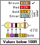 Two other colours are also widely used; gold and silver, commonly as tolerance markings on resistors (along with certain other colours), but they also double up as division factor markings for resistances below 10 Ohms. Their assigned tolerance values are �5% for gold and �10% for silver. As division factors their values are �10 and �100 respectively.