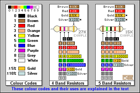 left shows a four colour banded resistor, together with a conversion chart to enable you