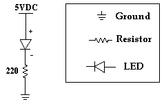 Ohm's Law can be used with resistors to find the current flowing through a circuit. The law is I = V/R (where I = current, V = voltage across resistor, and R = resistance). For the circuit above we can only use Ohm's law for the resistor so we must use the fact that when the LED is on, there is a 1.9 voltage drop across it (BTW: The voltage drop varies with the type of LED). This means that if the positive leg is connected to 5 volts, the negative leg will be at 3.1 volts (i.e, 5.0-1.9=3.1). Now that we know the voltage on both sides of the resistor and can use Ohm's law to calculate the current. The current is (5.0-1.9) / 220 = 3.6 / 2000 = 0.0014 Amperes = 14 mA