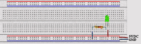 Step 5.) Use a short jumper wire (use red since it will be connected to the positive voltage) to go from the positive power row (the one with the red stripe beside it) to the positive leg of the LED (not in the same hole, but in the same row). Use another short jumper wire (use black) to go from the ground row to the resistor (the leg that is not connected to the LED). Refer to the picture below if necessary.