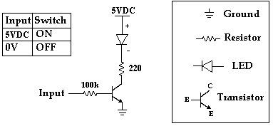If we want more current flowing through the LED, we can use a smaller resistor (instead of 220) and we will get more current through the LED without changing the amount of current that comes from the Input line into the 100k ohm base resistor. This means we can control things that use a lot of power (like electric motors) with cheap, low power transistor circuits. Soon you will learn how to use a computer to control real world events. Even though the outputs of a standard Windows-based computer can not supply enough current to turn lights and motors on and off, the computer can turn transistors on and off (since this requires so little current) and the transistors can control lots of current for lights and motors. This concept is called amplification and represents the fundamental concept of computer interfacing for real world experiments.