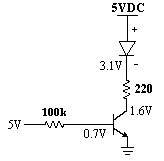 We want to use Ohm's law to find the current in the path from the Input to the Base of the transistor and the current flowing through the LED. To do this we need to use two basic facts about the particular transistors we are using: