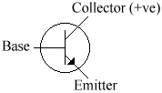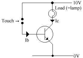 Normally there is no collector current (Ic), but if we provide the base with a very small base current (Ib), which we can do by touching the terminals, a much larger Ic is permitted to flow.