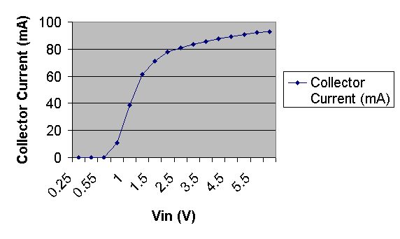 Vin (V) Ic (mA) 0.5 0 1.0 38.5 1.5 71.3 2.0 77.6 2.5 81.1 3.0 83.6 3.5 85.8 4.0 87.7 4.5 89.4 5.0 90.8 5.5 92.1 5.95 93.0 0.75 10.8 0.25 0 1.25 61.1 0.55 0.01 Note that the results above are not in order. Specifically, there are a couple of extra results on the end.