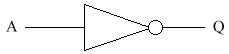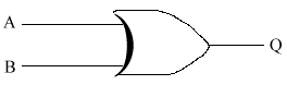 This is basically saying that Q comes on when either A or B are on. Note that my drawing skills are not very good, especially when you couple them with a mouse. So the OR gate is meant to look like an arrowhead. The general shape is there, but you just need to straighten it up a little. Note that the circuit diagrams become a little complicated now. So from now on, if there is a dot at a crossing of 2 wires, then the wires are joined. If there is no dot, then the wires just cross, with no connection or electrical conductivity between them.