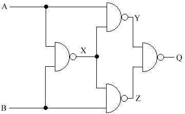 There is one other gate that is very useful. It is called the eXclusive OR (XOR). You can buy this in a chip, or you can build your own. It can be constructed in the following way.