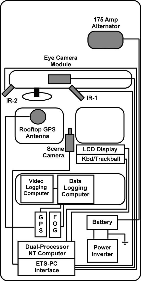Dual-Processor NT Computer. The ASL ETS-PC control software operates on a specially configured dual-processor computer running Windows NT 4.0. This unit is shock-mounted in the trunk compartment. The operator interface to the control software is mediated by a high-contrast, flat panel display mounted on the rear of the front passenger seat (making it easily viewable from the rear passenger seat). A keyboard equipped with an integrated trackball sits on the experimenter's lap during operation of the eye tracker. The trackball is used as a replacement for the mouse interface. Power for the main control computer is supplied directly from the 1500 watt AC power inverter (described above).