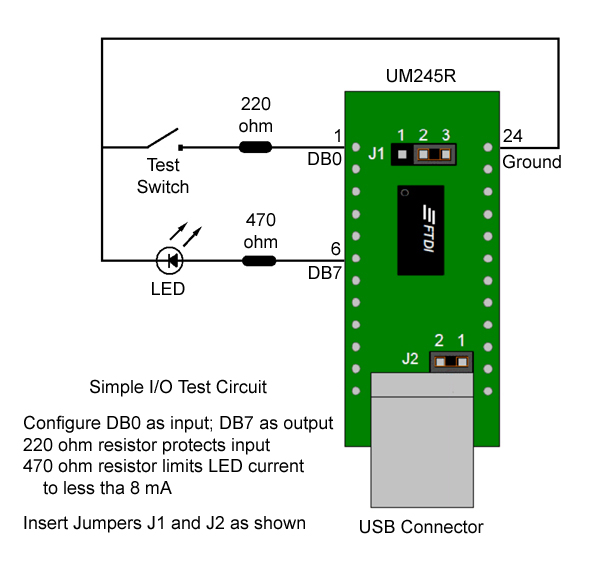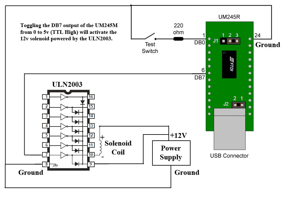 Fig. 5: Sample Setup for Testing the UM245R Hardware [Sample circuit: 12v solenoid driver]